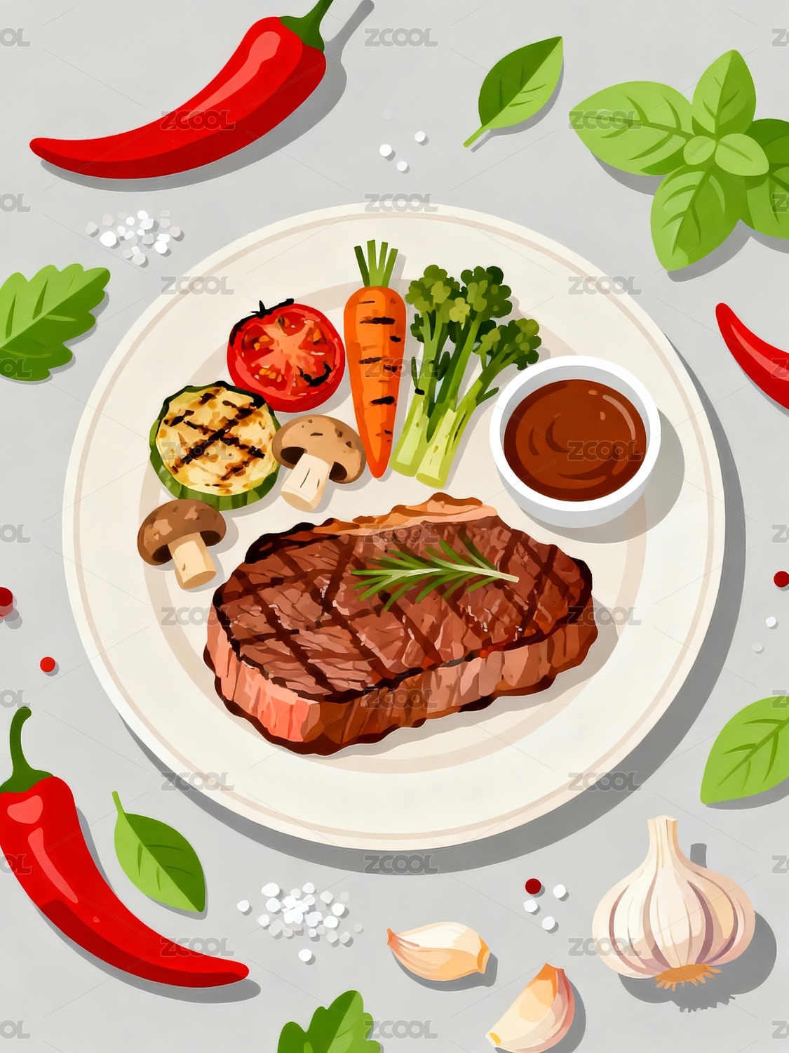 牛排搭配蔬菜香料的美食插画