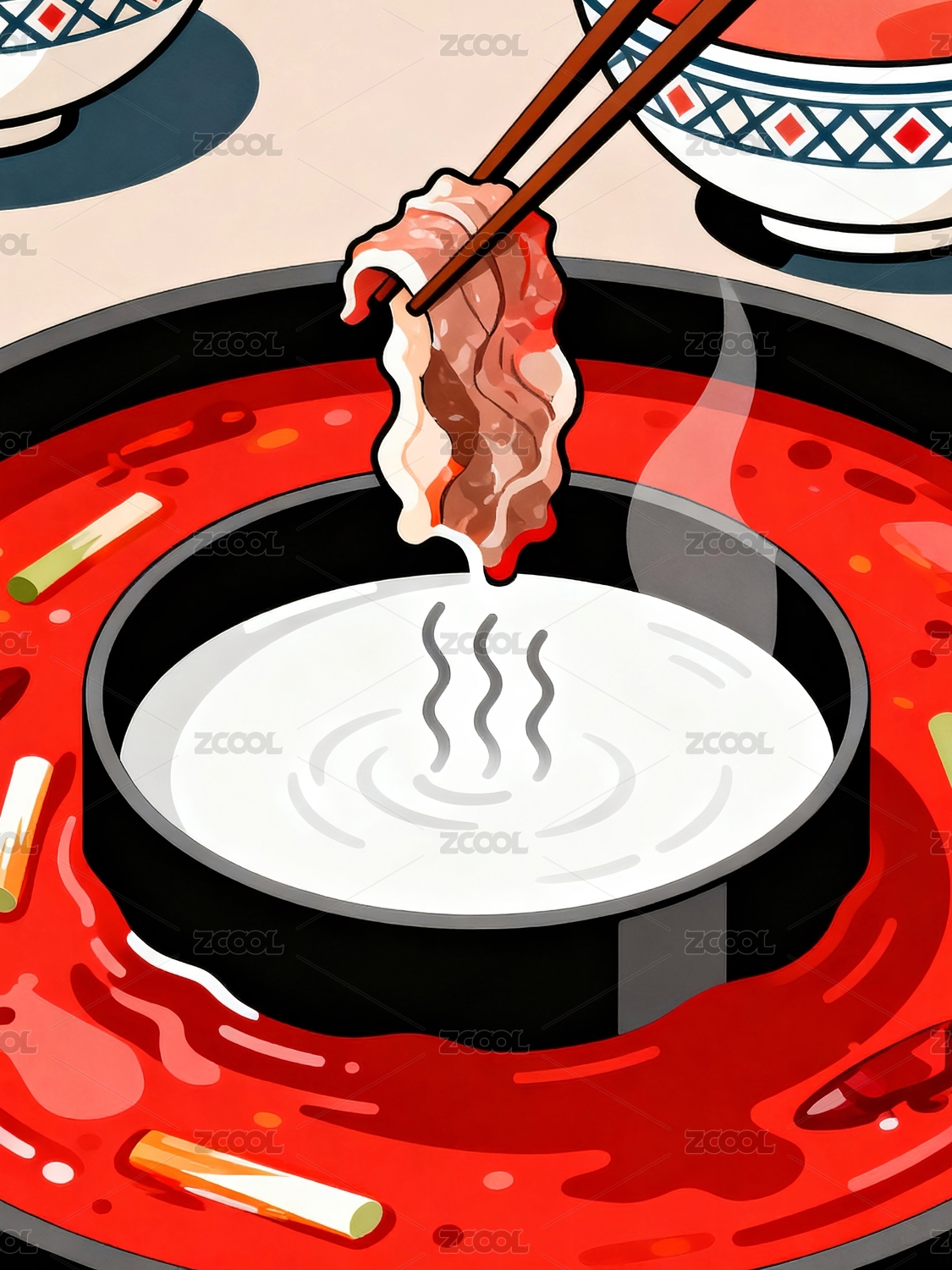 热气腾腾的美味自助火锅 牛肉蔬菜菌菇蛋糕卡通动漫风的矢量插画