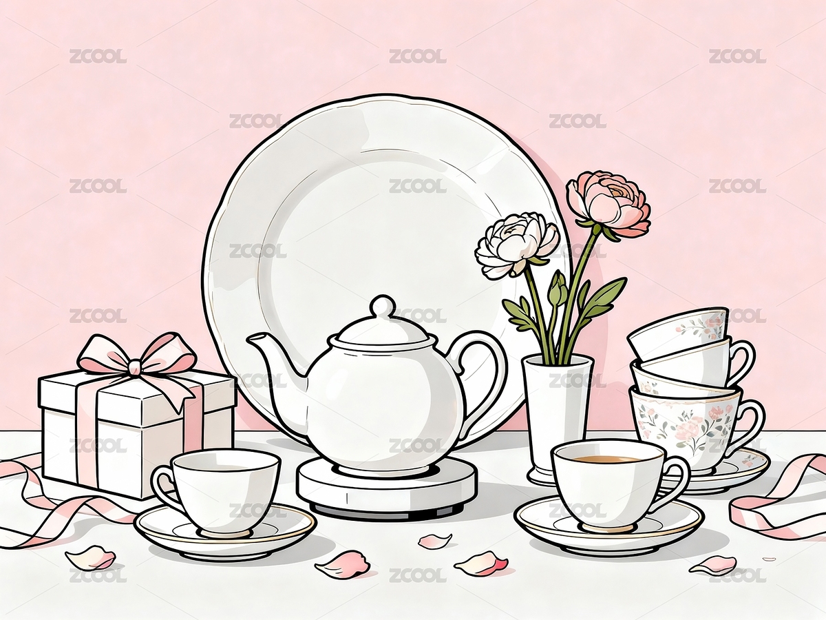 饮品,白色,盘子,装饰,餐具,餐桌,茶壶,茶杯,礼物,鲜花