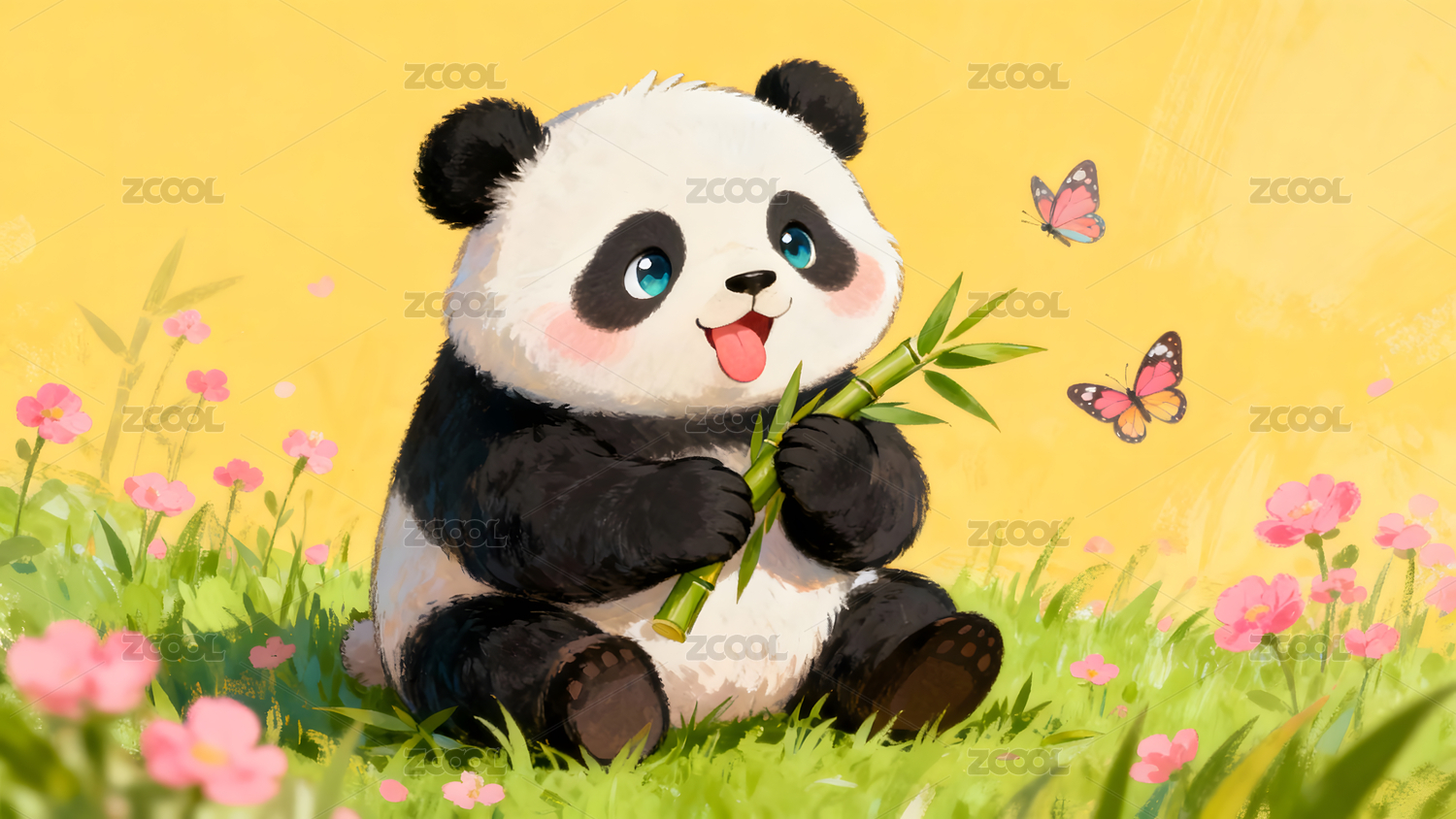 熊猫,大熊猫,国宝,中国风,卡通,可爱,插画,春日,花丛,远山