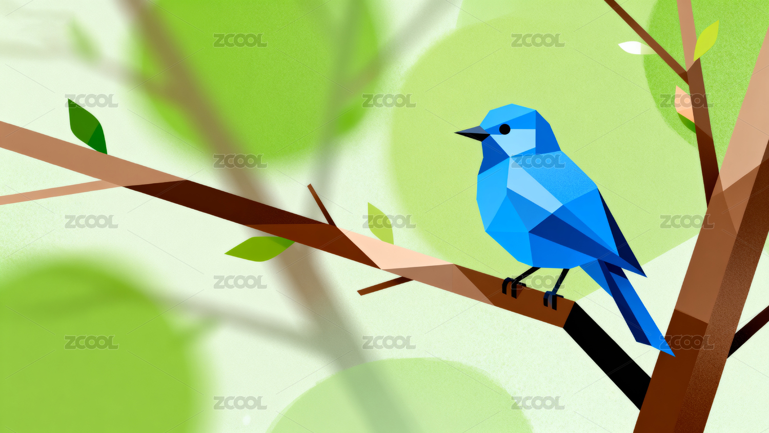 几何风格蓝鸟栖息树枝画面