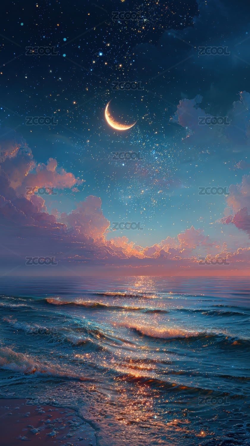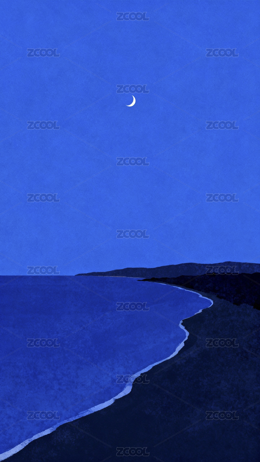 月亮,夜晚,海边,海岸,月光,静谧,蓝色,夜空,海浪,沙滩
