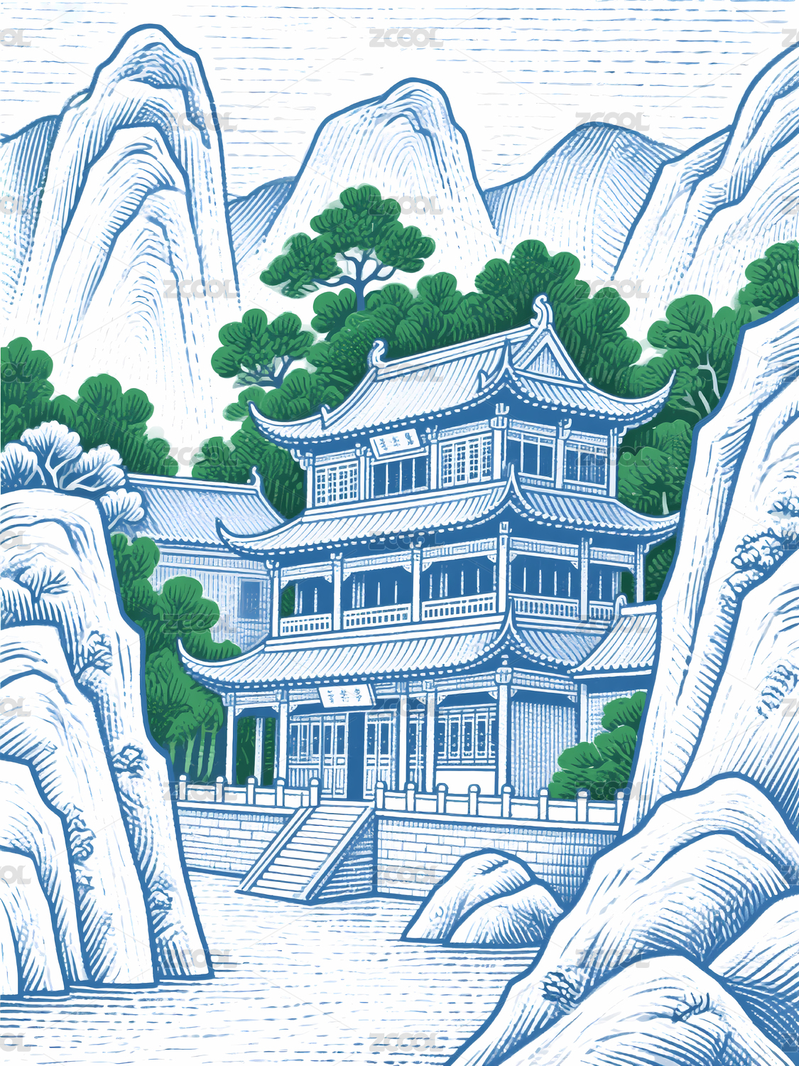 青花瓷绘中国古建楼阁艺术插画