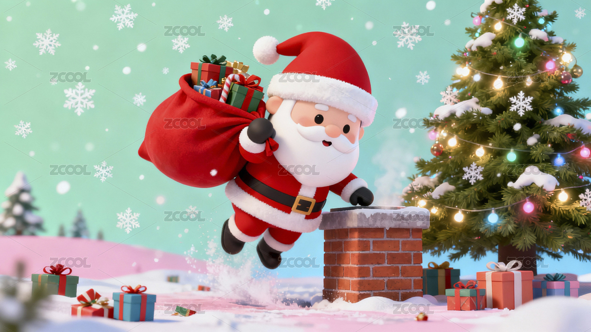 圣诞老人,烟囱,礼物,圣诞树,雪景,圣诞节,雪花,彩灯,节日,氛围