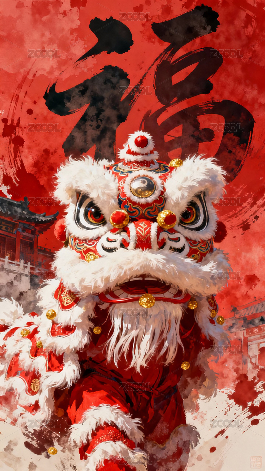 舞狮,红色,卷轴,喜庆,新年,中国风,祥瑞,狮子,传统,春节