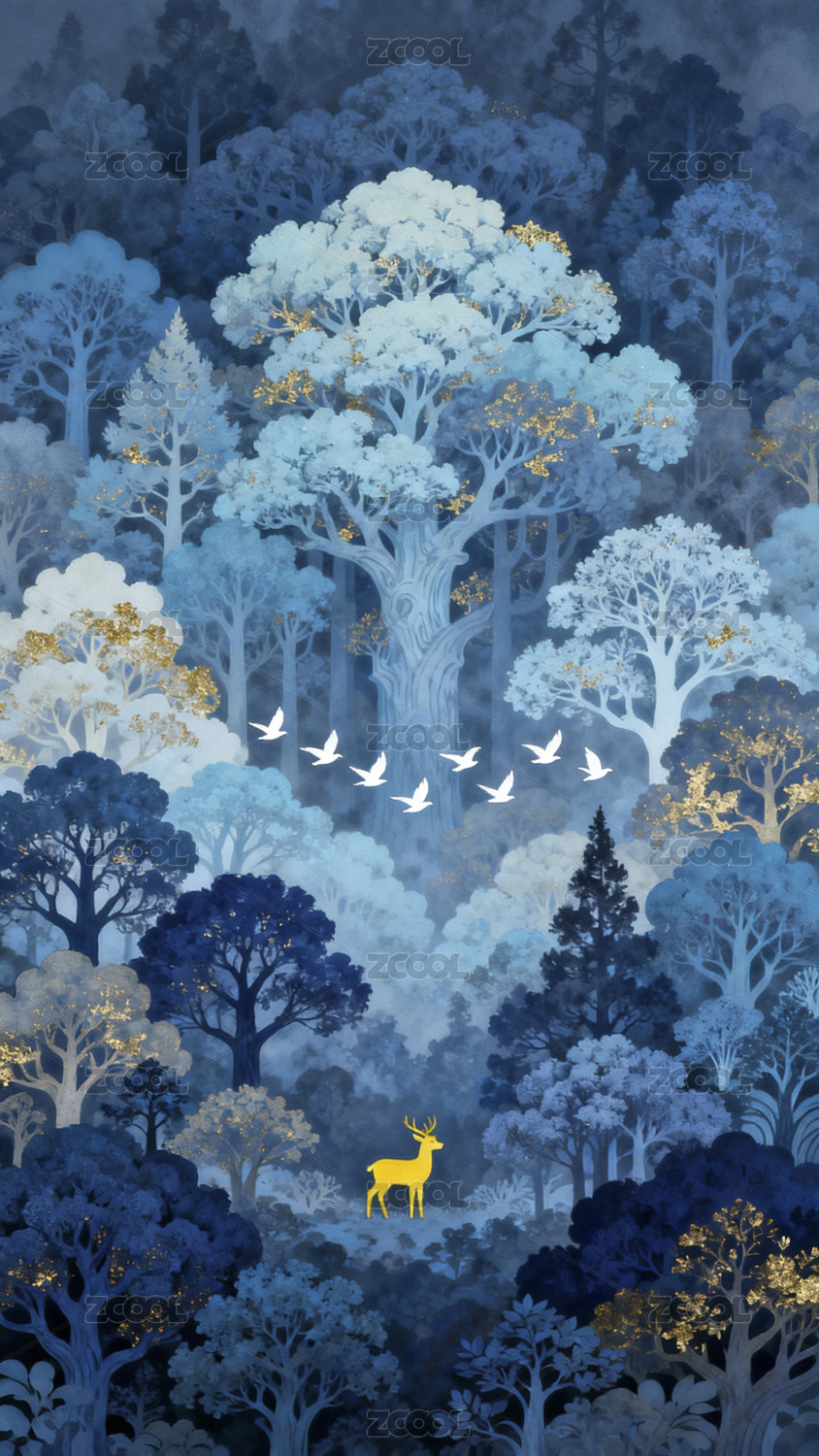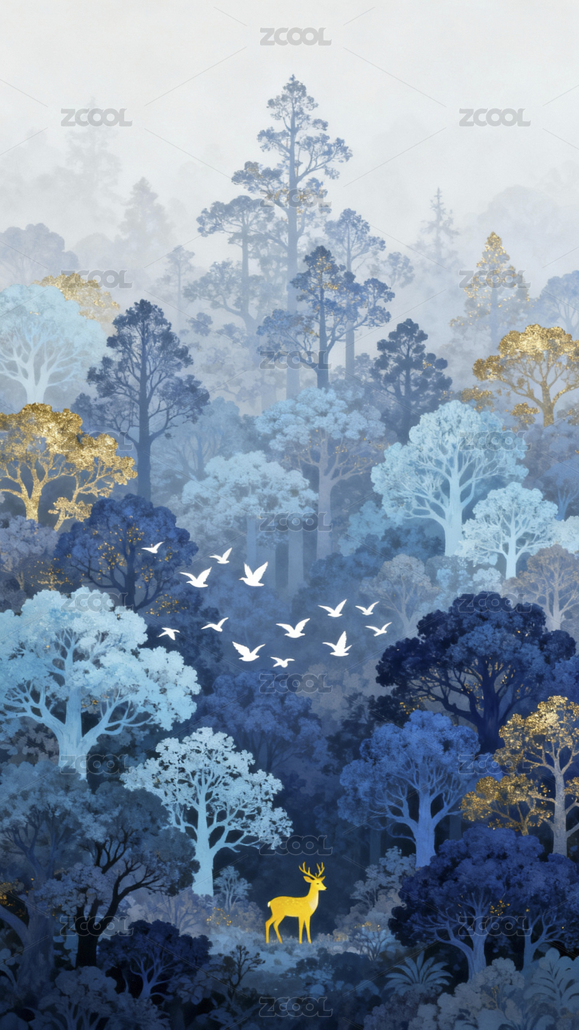 森林,麋鹿,飞鸟,蓝色,金色,梦幻,插画,意境,自然,动物