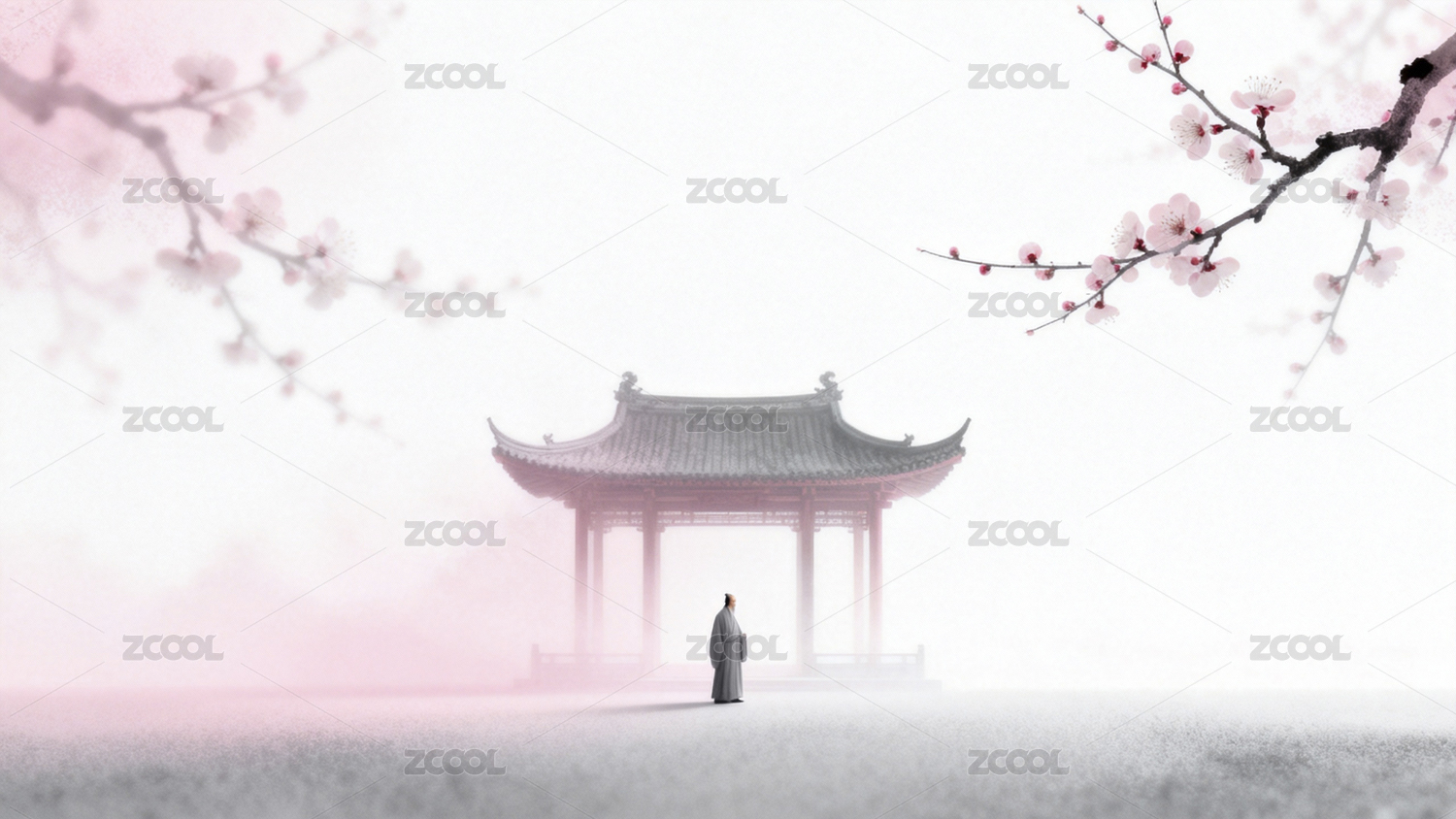古风,亭子,梅花,禅意,意境,中国风,水墨,粉色,古装,静谧