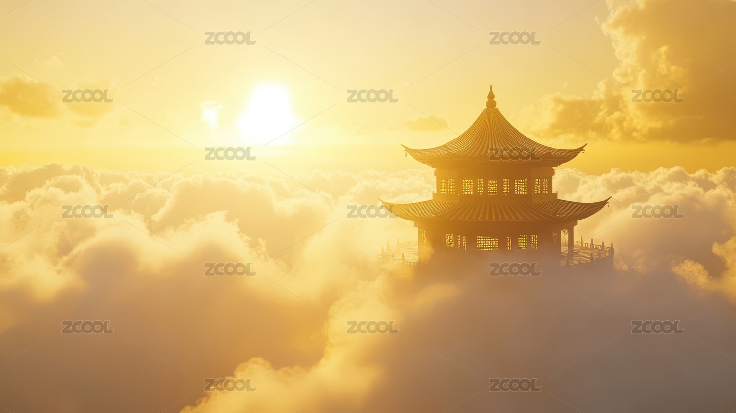云海,古建筑,宫殿,霞光,金色,仙境,云端,中国风,云雾,日出