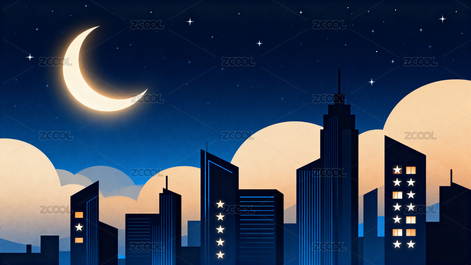 夜幕下的城市高楼与弯月星辰