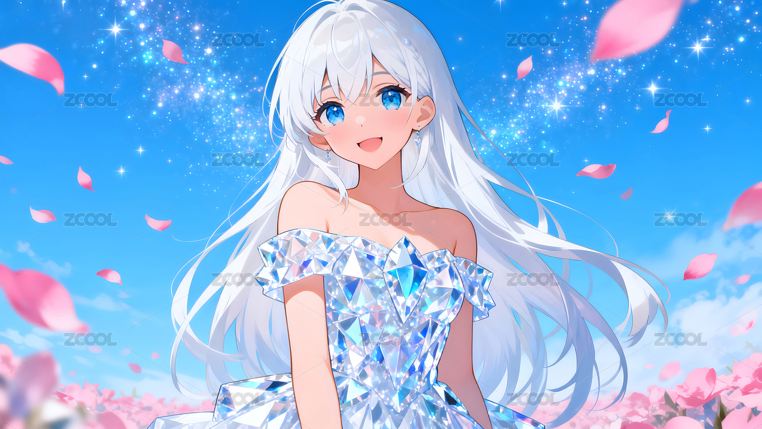 动漫,二次元,少女,唯美,樱花,春天,银发,裙子,角色,插画