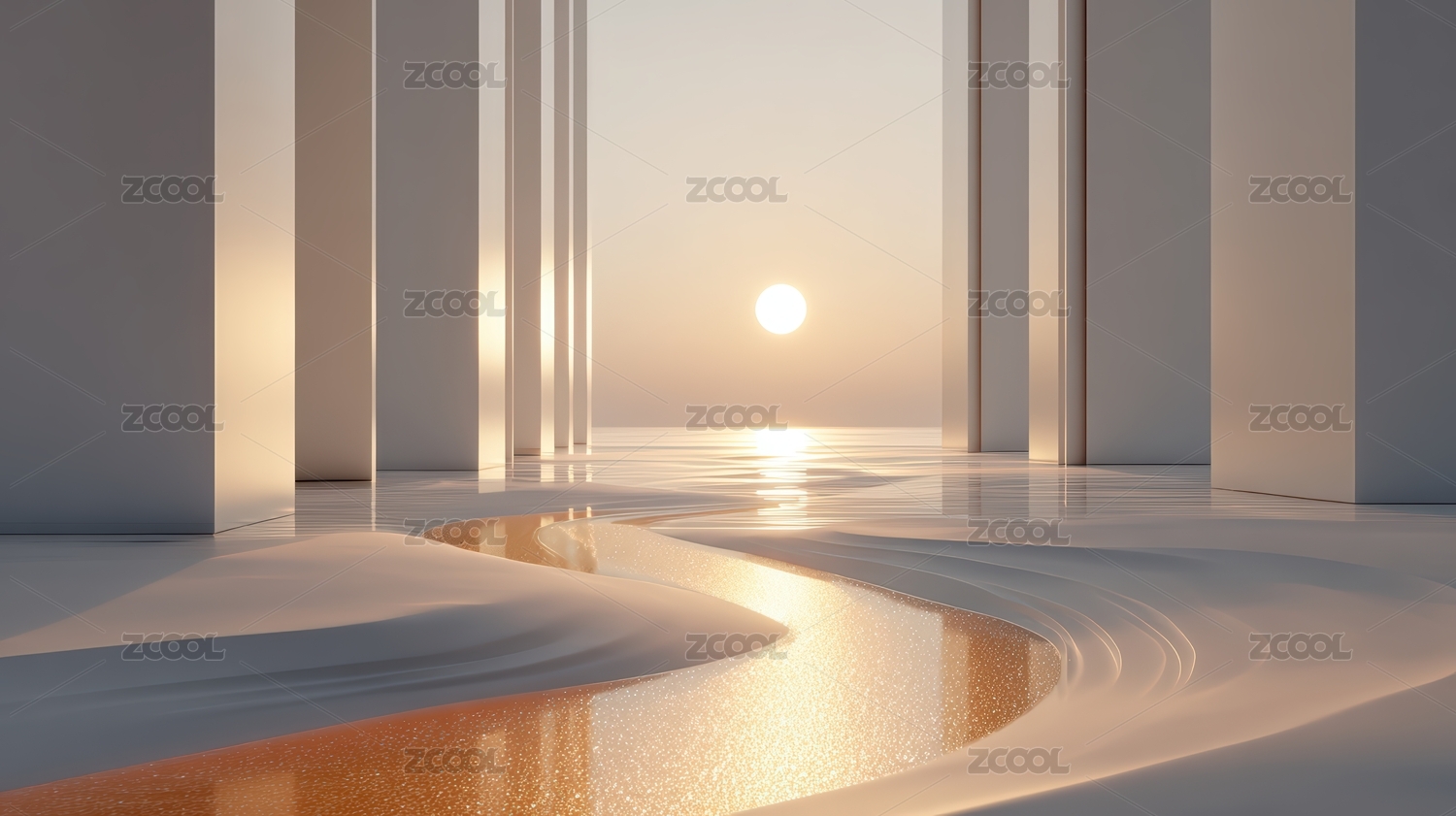 光影,反射,建筑,现代,柔和,极简,空间,水面,曲线,日出