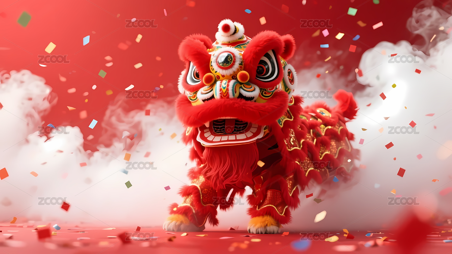 橙色舞狮头配彩色纸屑