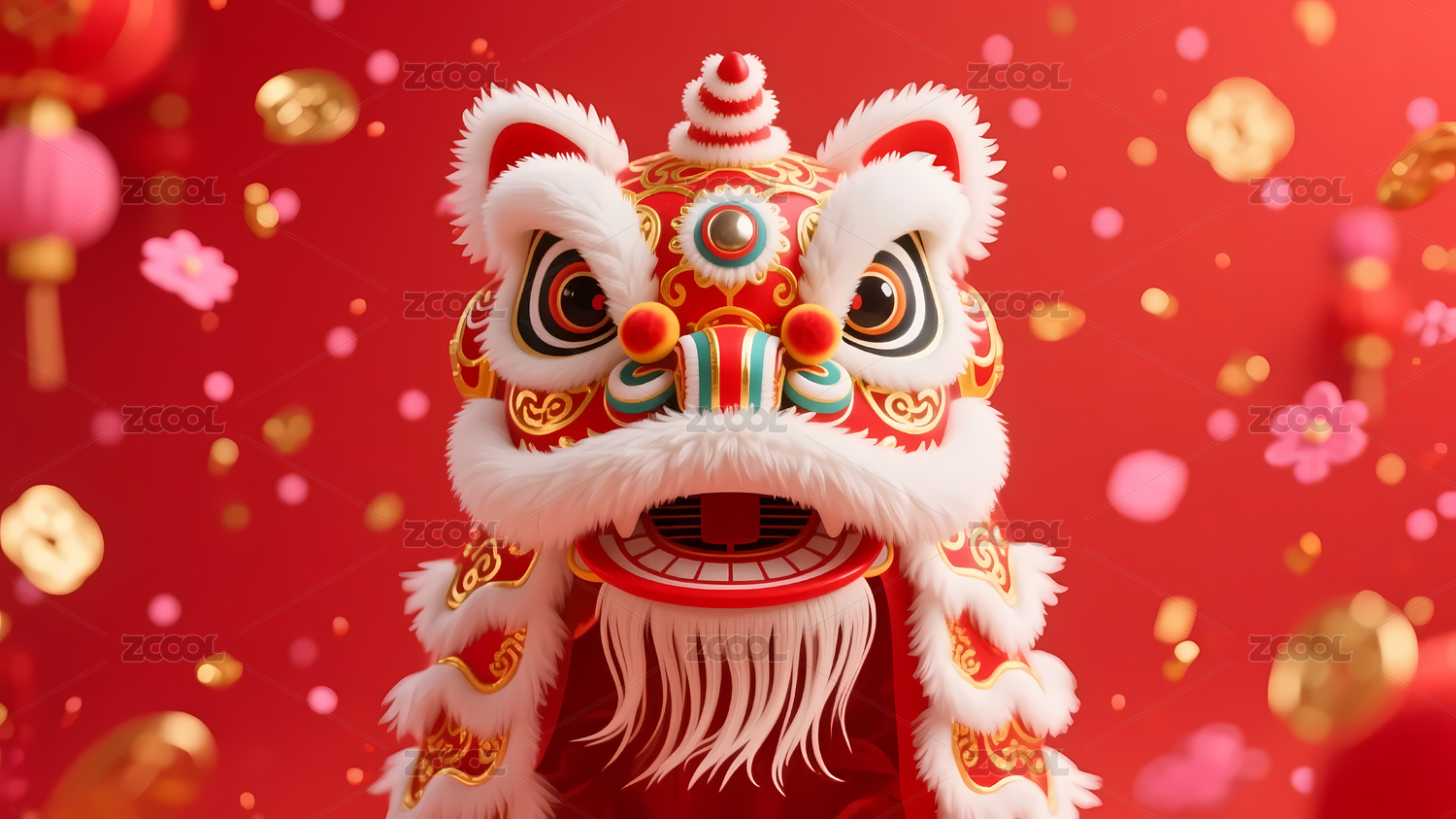 红金舞狮粉色灯笼蓝天