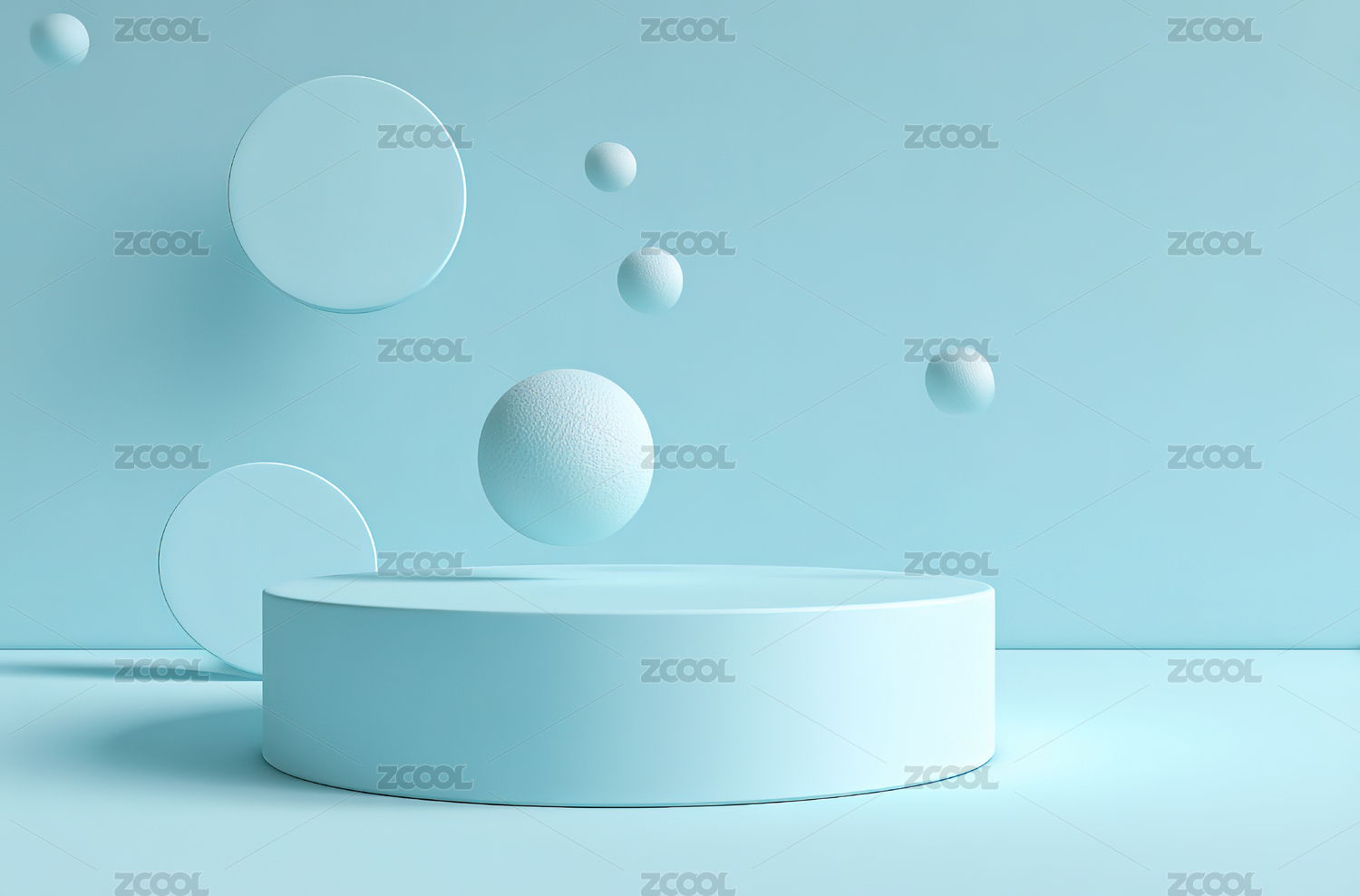 浅蓝背景下的圆形展台与悬浮球体