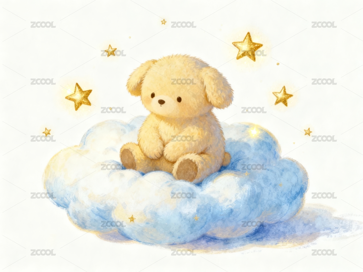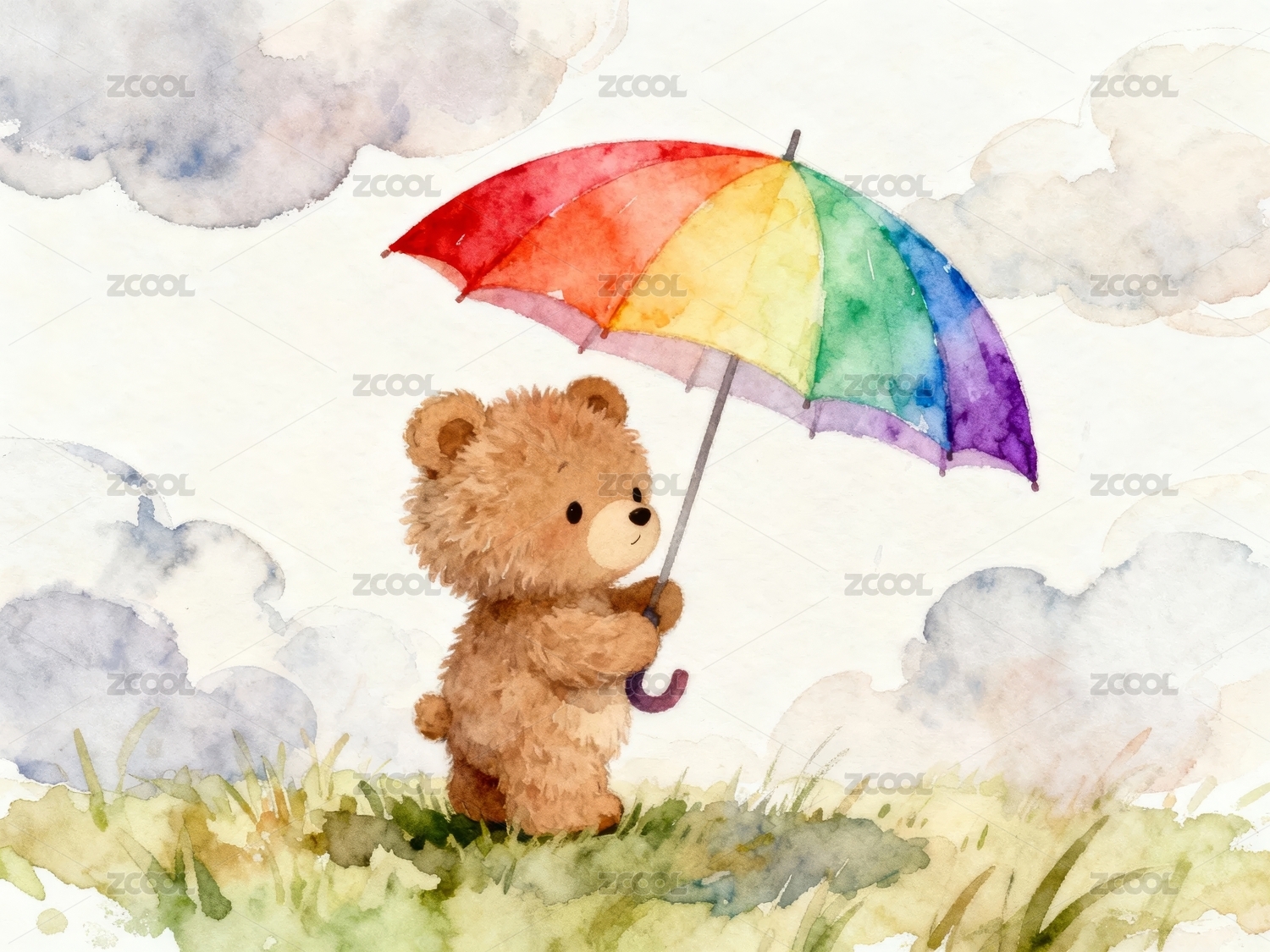 小熊,彩虹,雨伞,毛绒,可爱,云朵,草地,天空,夜晚,水彩