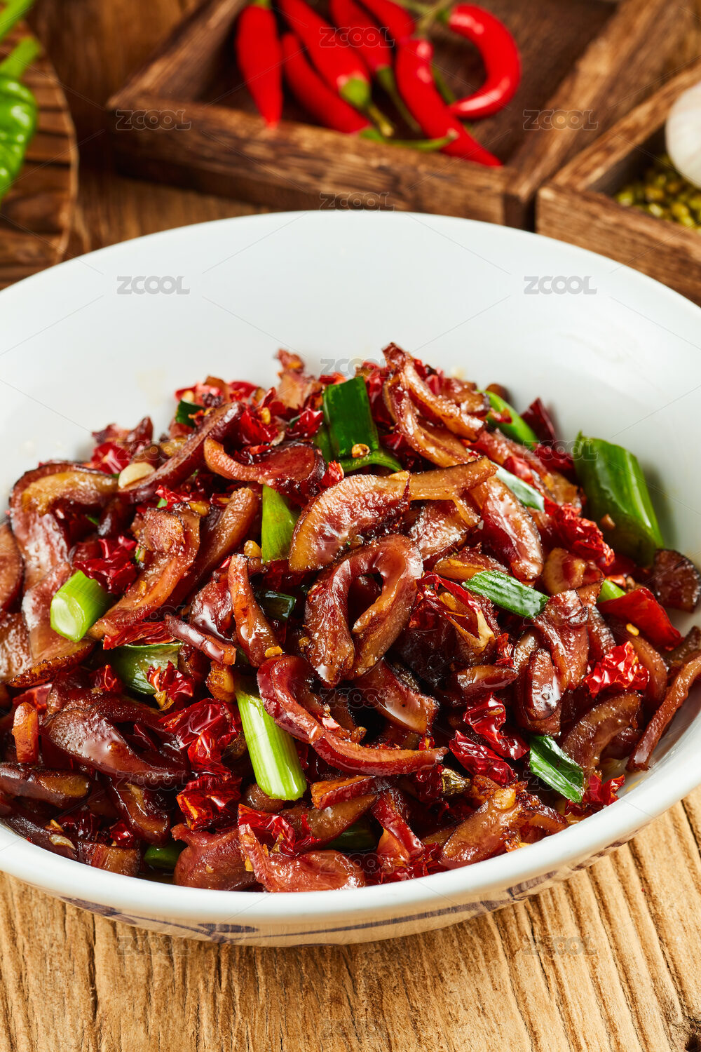 中国风场景里木盘子上装着一些麻辣牛肉丝