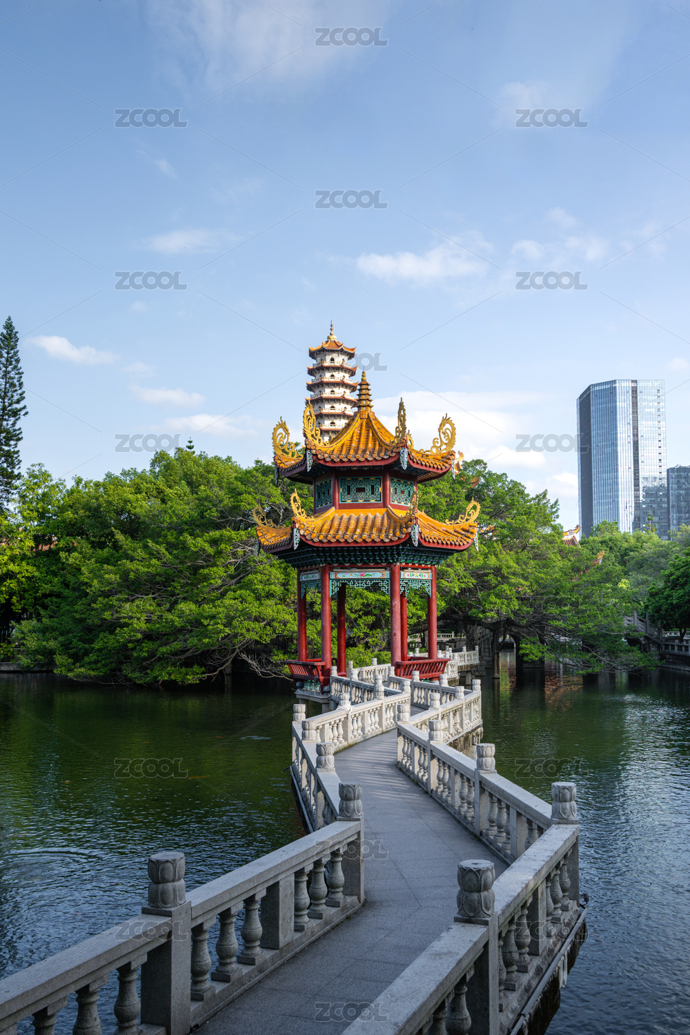 福建省福州市西禅寺中的牌楼与现代城市