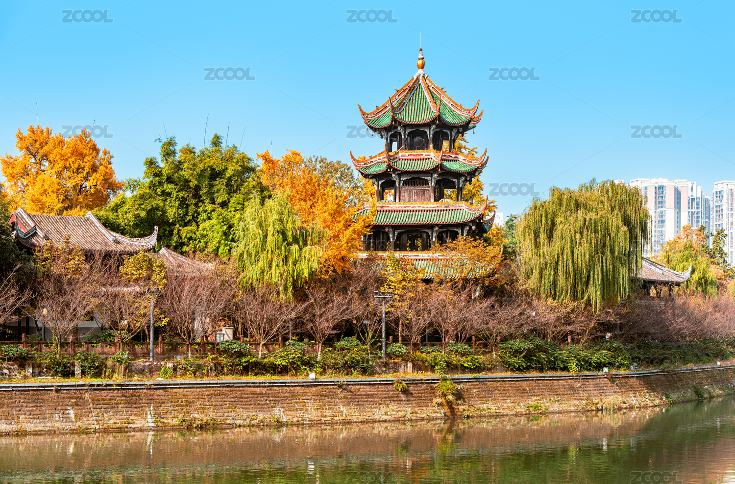 中国成都望江楼公园崇丽阁银杏秋季风光
