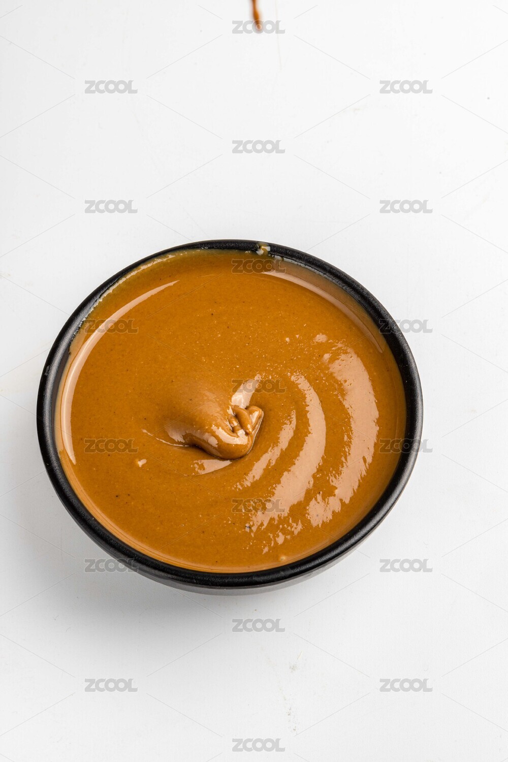 白色桌面上放着一碗麻酱