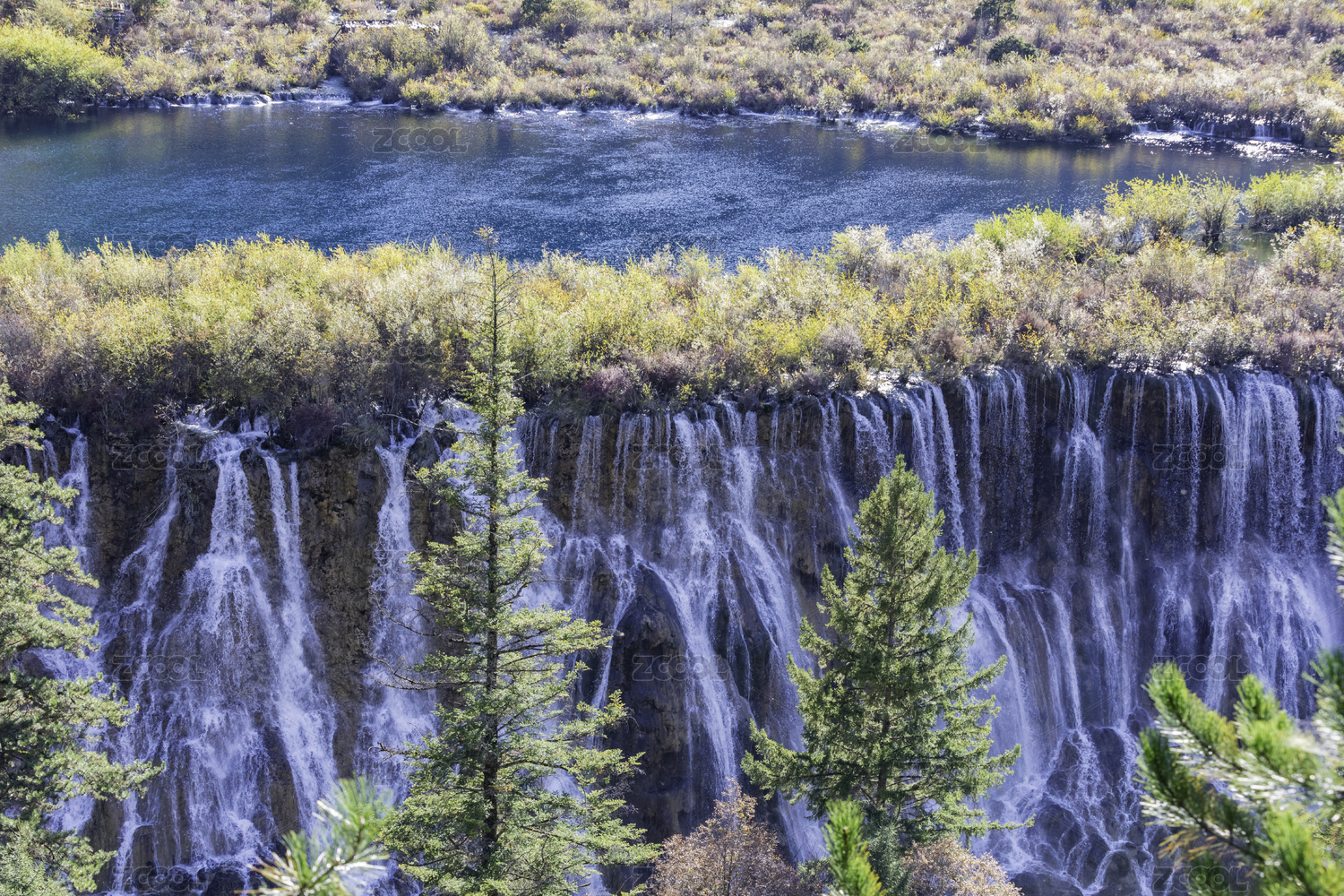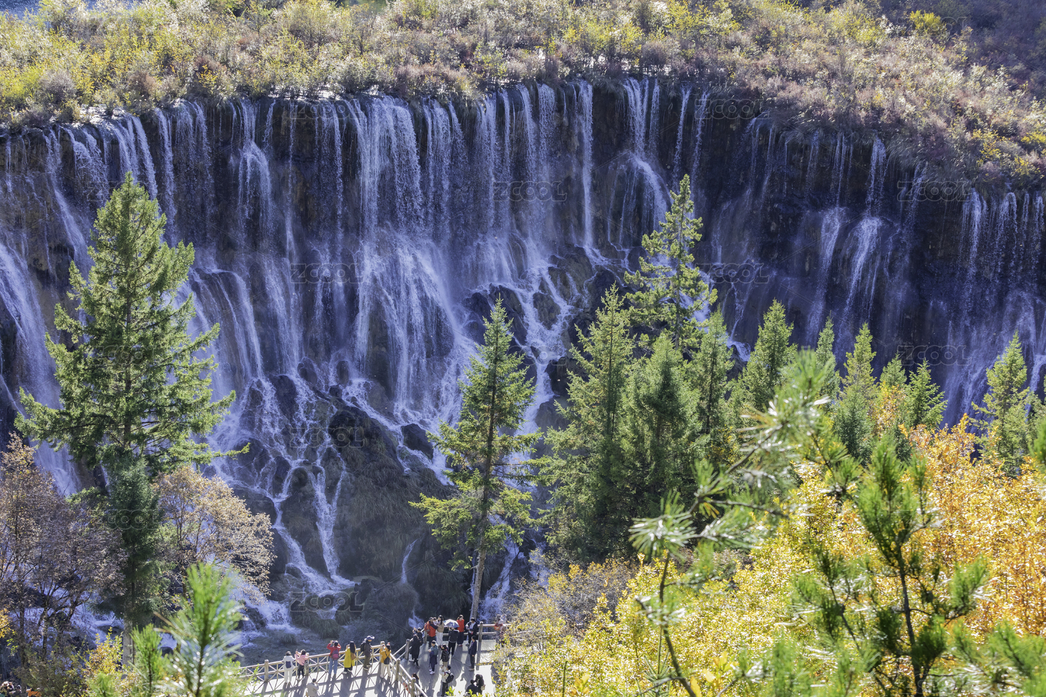 从高空俯瞰九寨沟诺日朗瀑布秋季彩林自然景