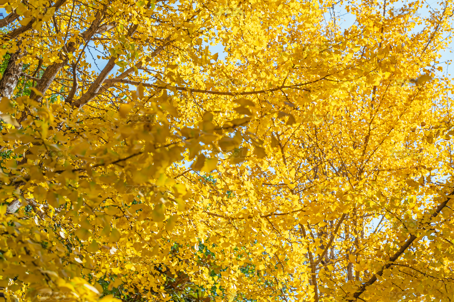 仰拍茂密的金黄色银杏树
