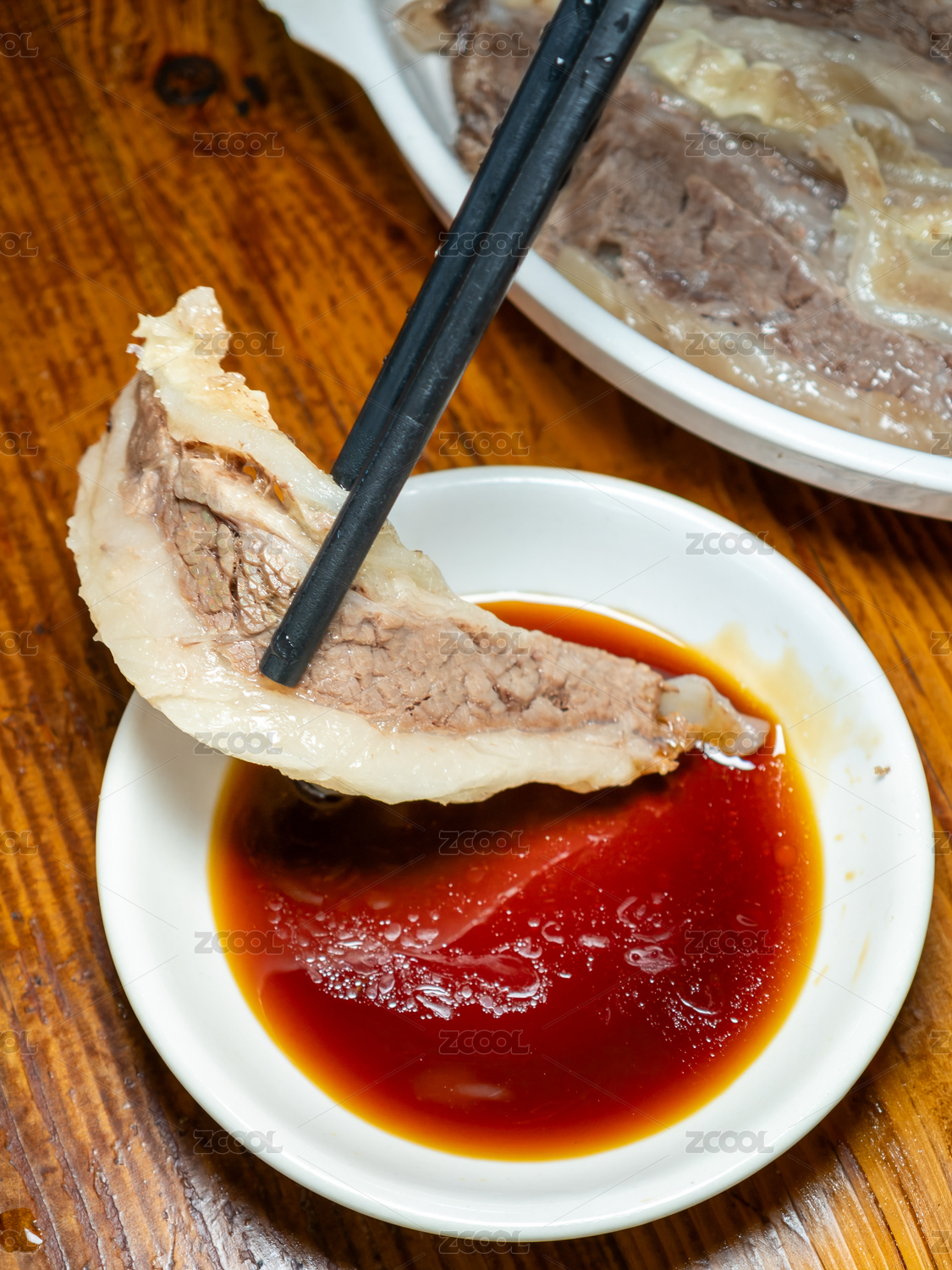 筷子夹起涮好的牛肉蘸酱特写