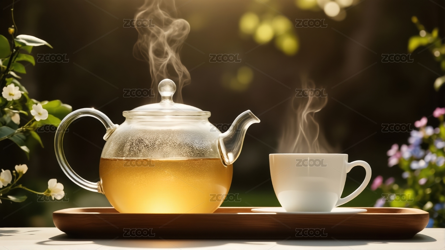 蒸汽袅袅升起的茶壶与花香