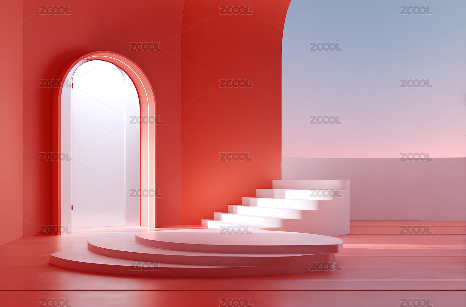 红色拱门与阶梯的现代空间