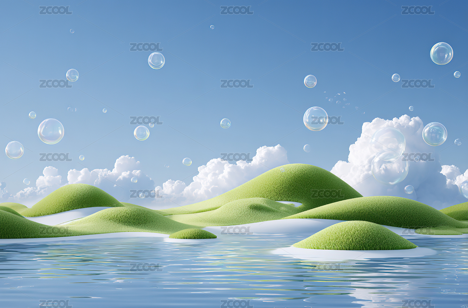 水面上的绿色丘陵与气泡