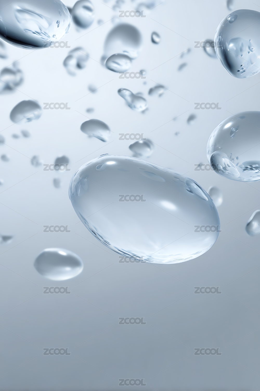 透明水滴悬浮在浅蓝色背景上