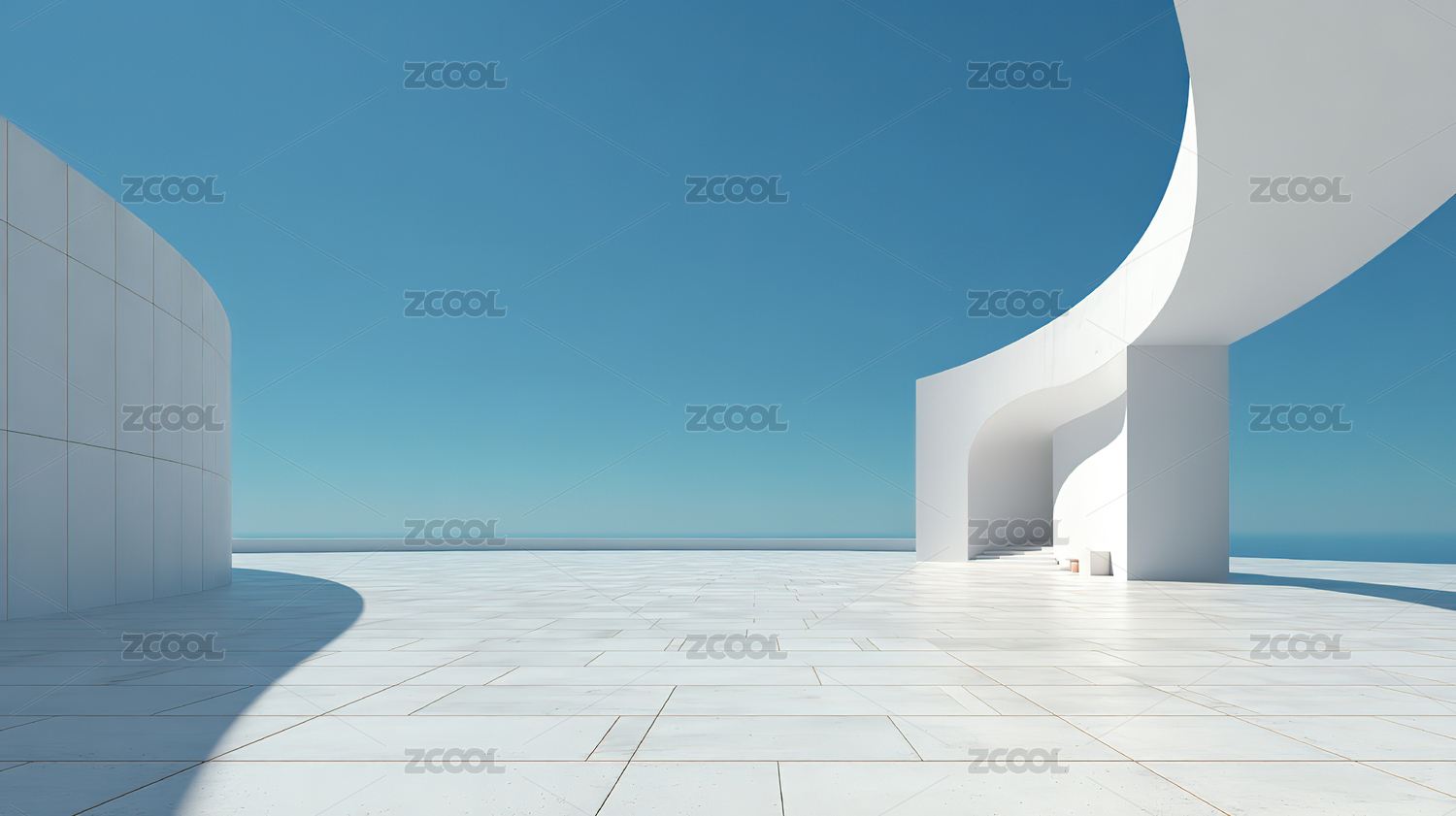 砖地地面与白色弯曲建筑有干净明亮天空背景