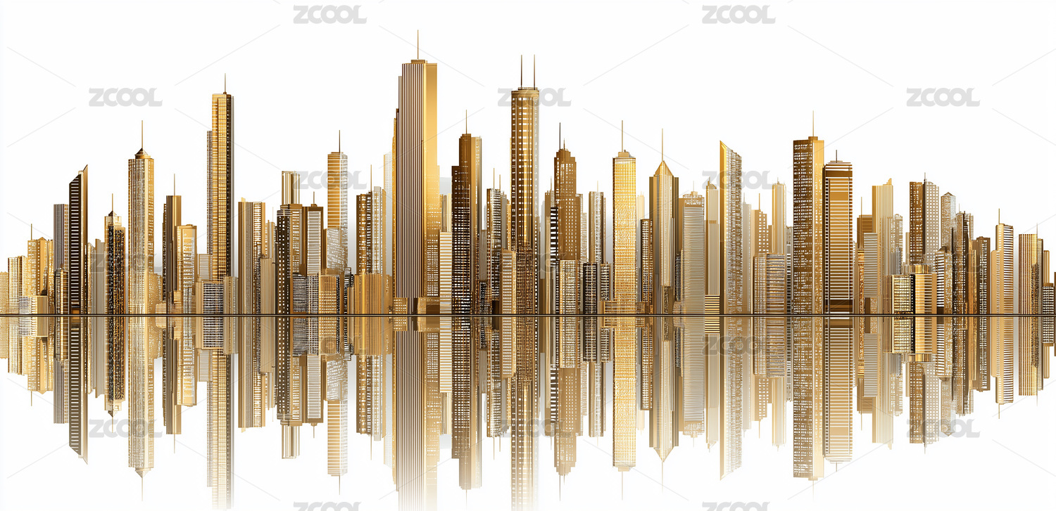 金色城市建筑群及水面倒影全景图