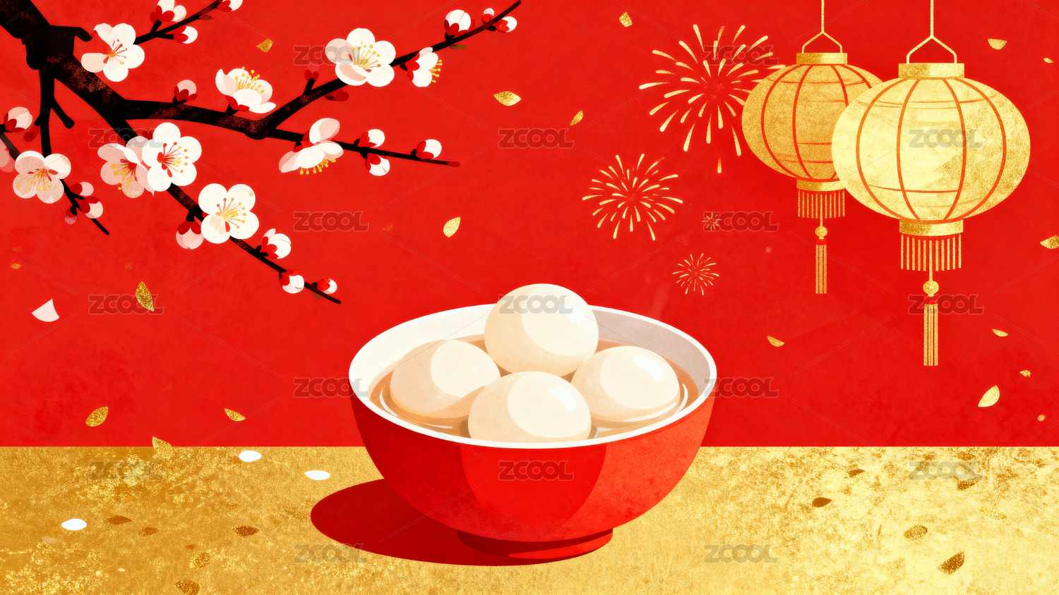 元宵佳节一碗汤圆和灯笼猜灯谜等国潮风插画