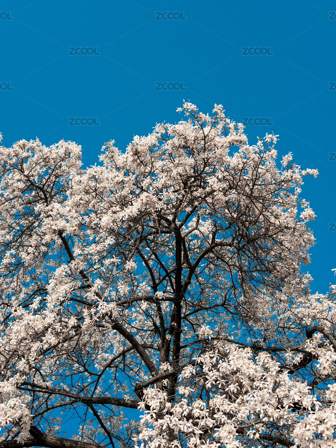 春天蓝天下盛开的白色玉兰花树