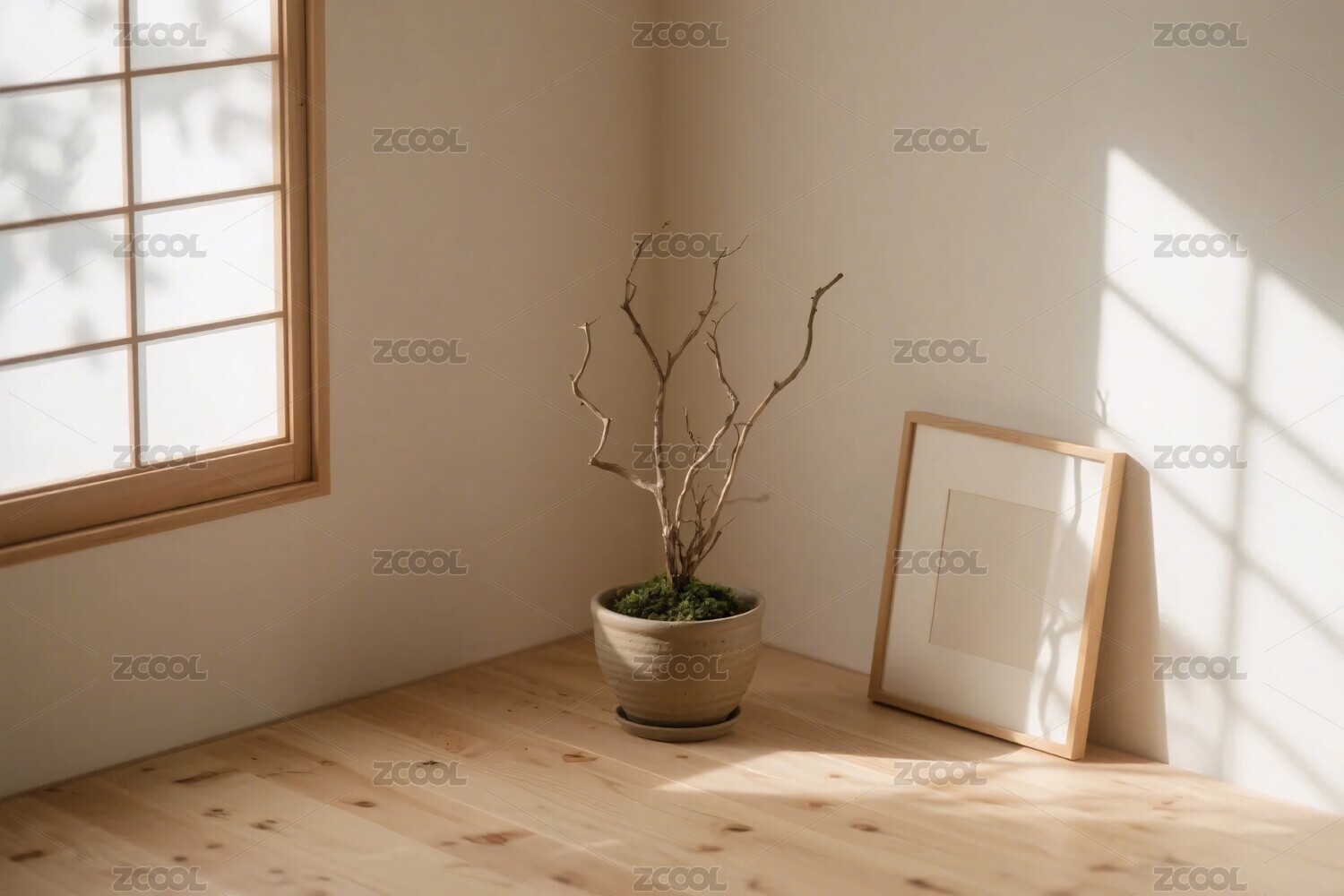 阳光洒落的简约室内角落摆放着绿植与装饰品