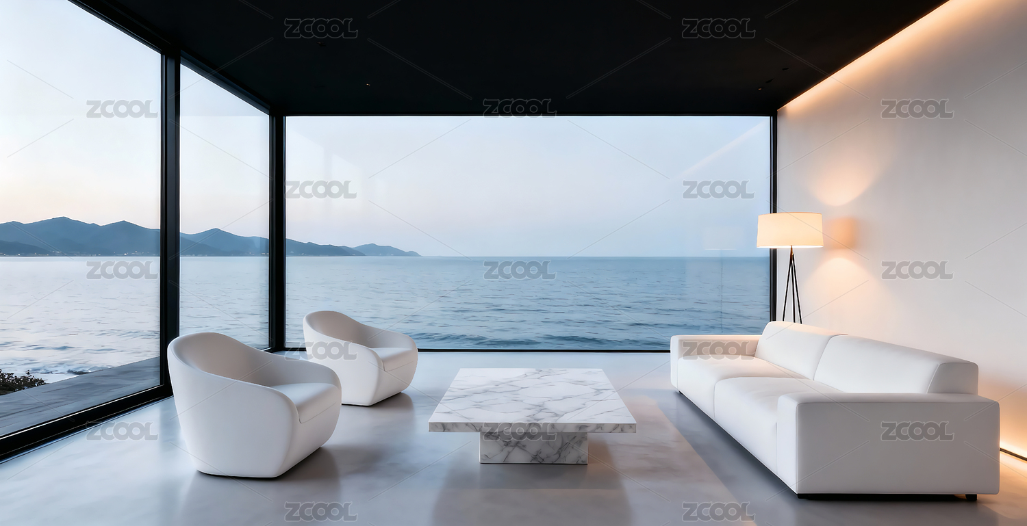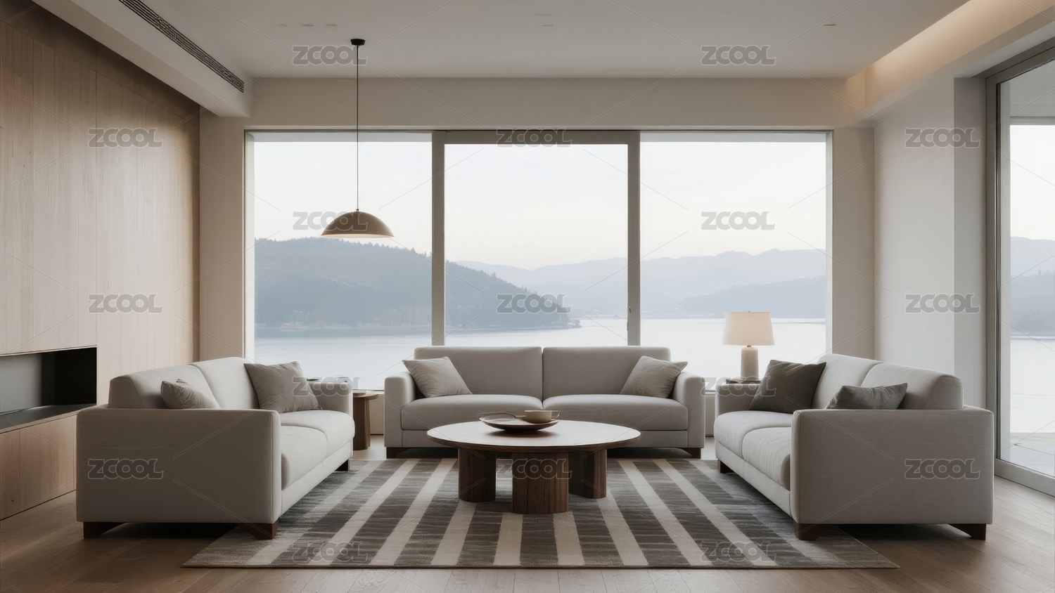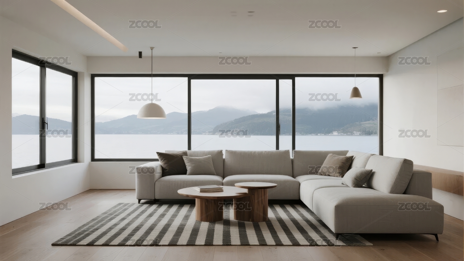 现代客厅拥有大面积落地窗可欣赏湖景和远山
