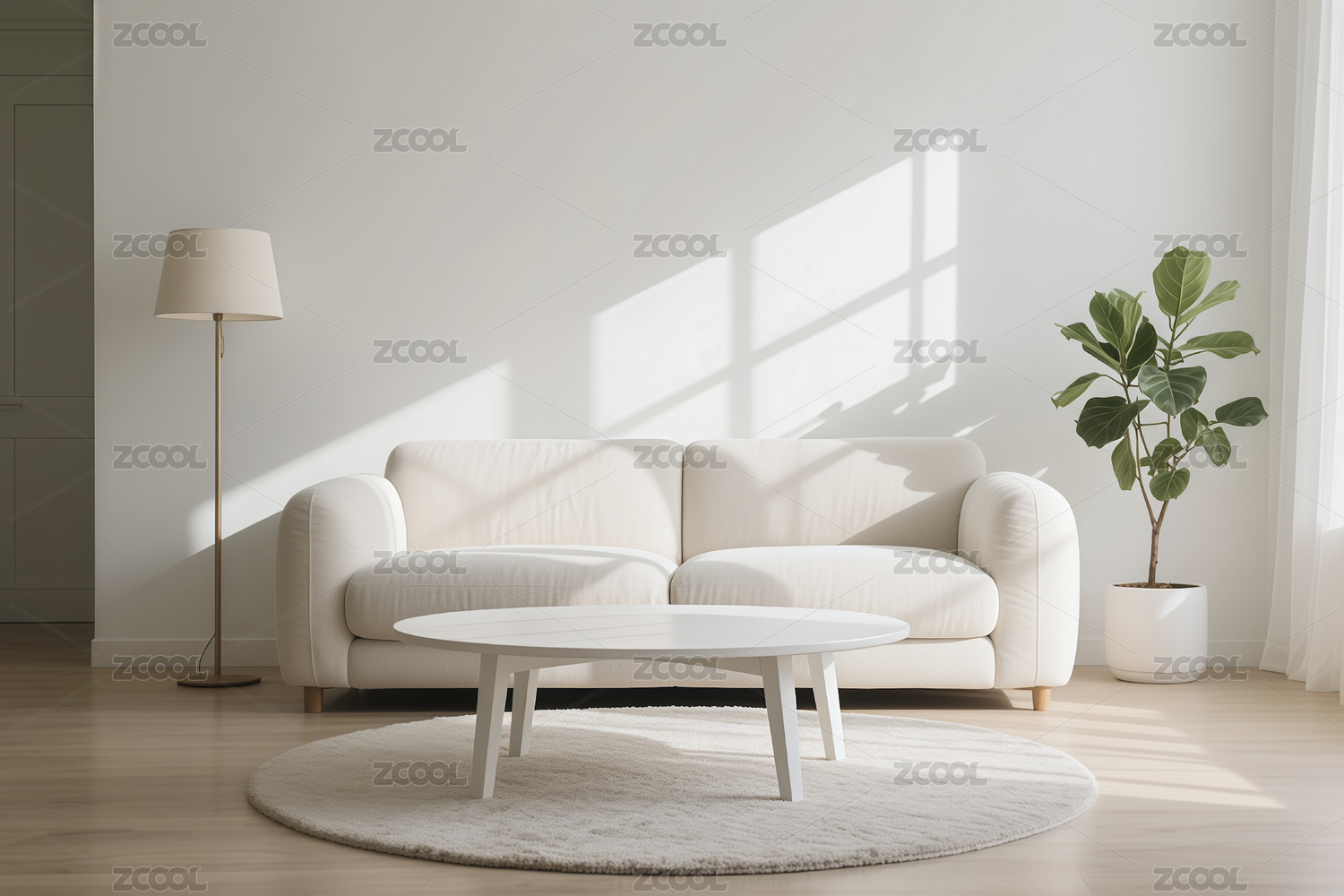 客厅内白色沙发茶几落地灯盆栽场景设计