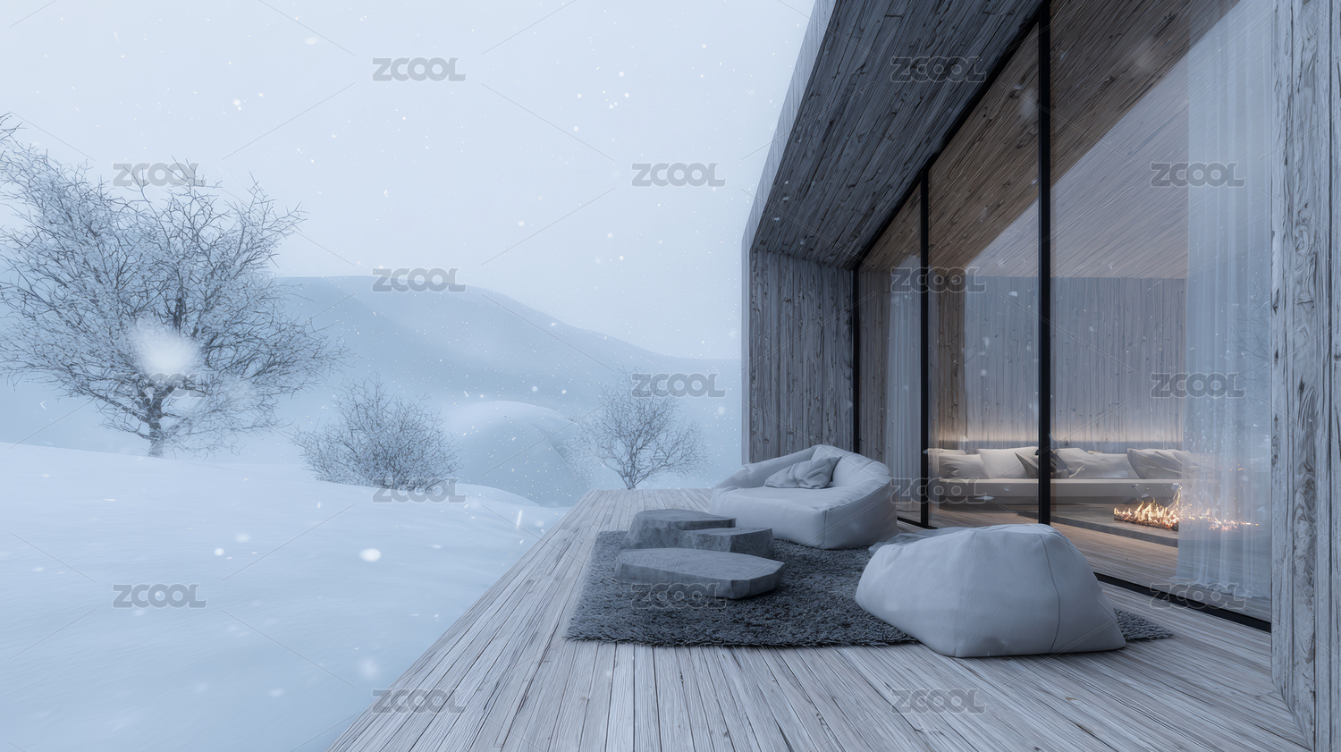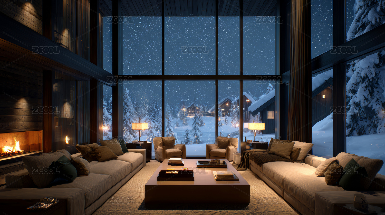 雪山,木屋,雪景,落地窗,别墅,壁炉,冬季,简约风,度假,山景