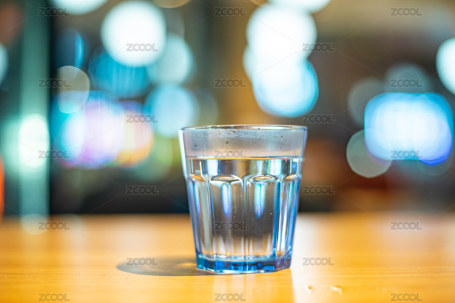 茶几上的玻璃杯和柠檬水背景是城市夜景
