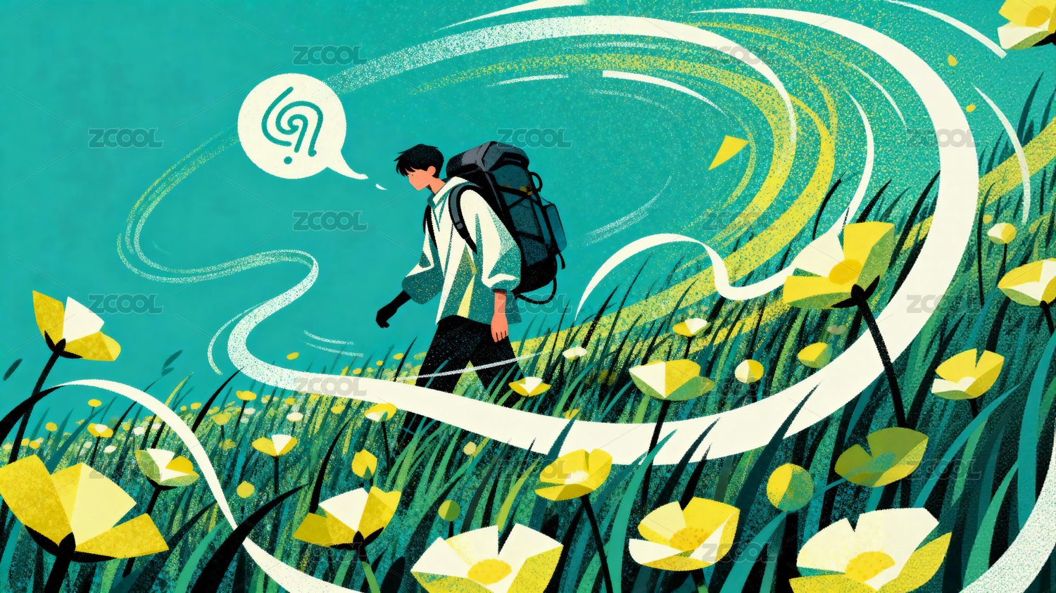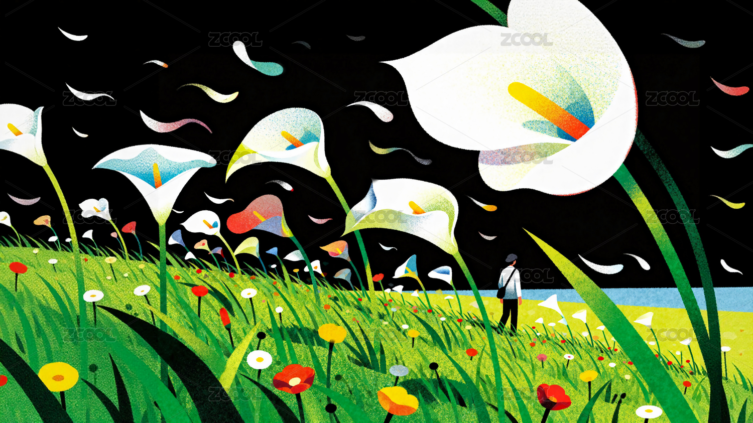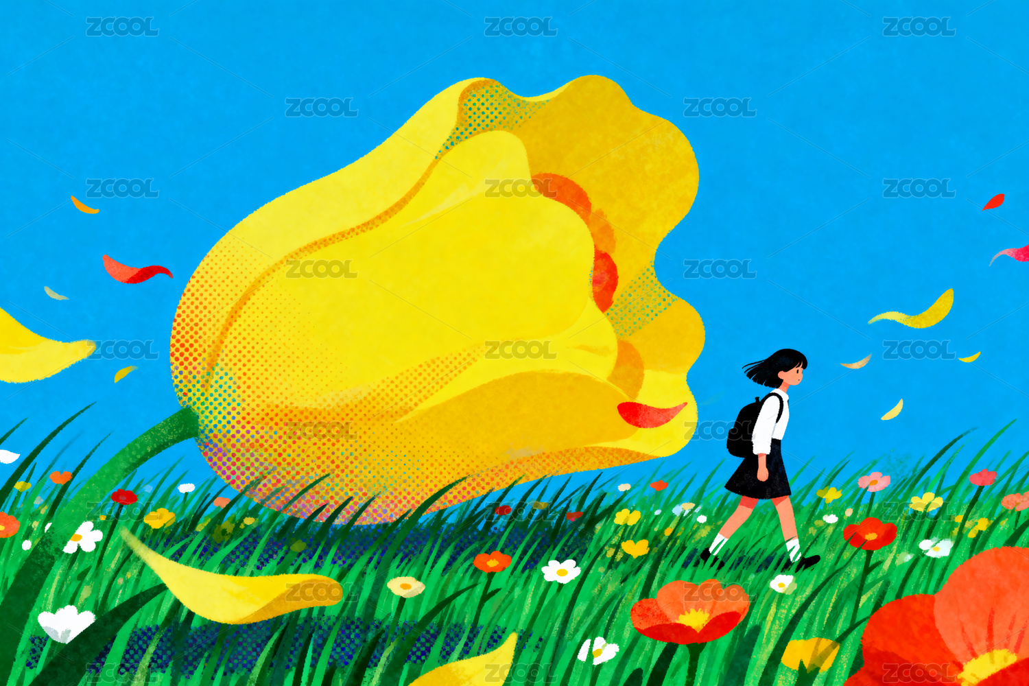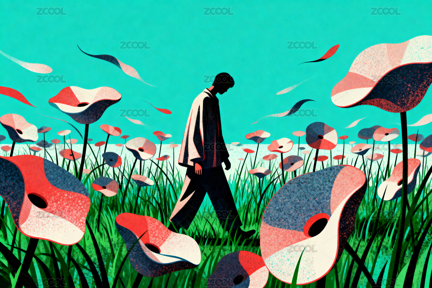 插画,艺术,绘画,超现实,抽象,人物,花海,花卉,创意,想象力
