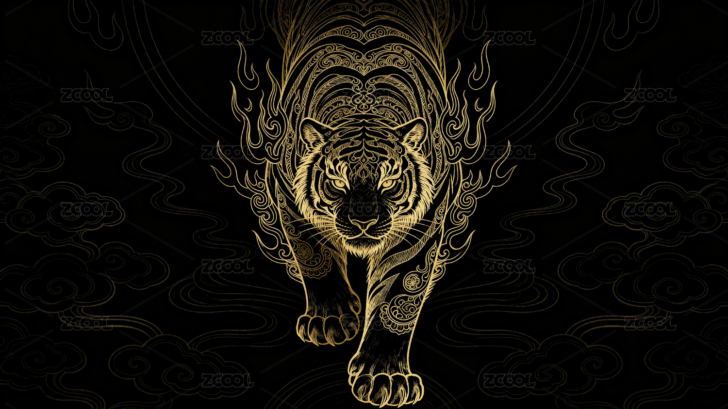 猛虎,黑金,暗纹,复古,威严,华丽,暗黑,插画,锐利,神秘