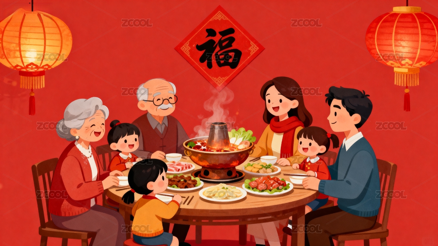 花朵,装饰,青年,老人,家人,火锅,团圆,欢笑,热气,围坐
