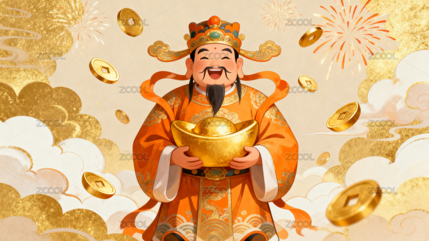 财神手持金元宝烟花绽放