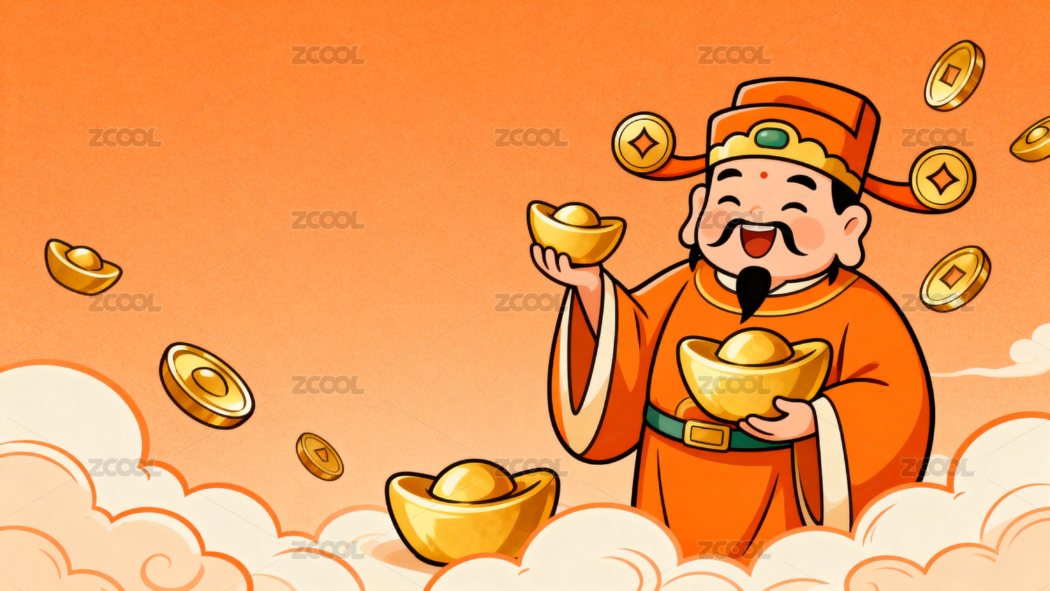 财神手持金元宝云中飘落金币