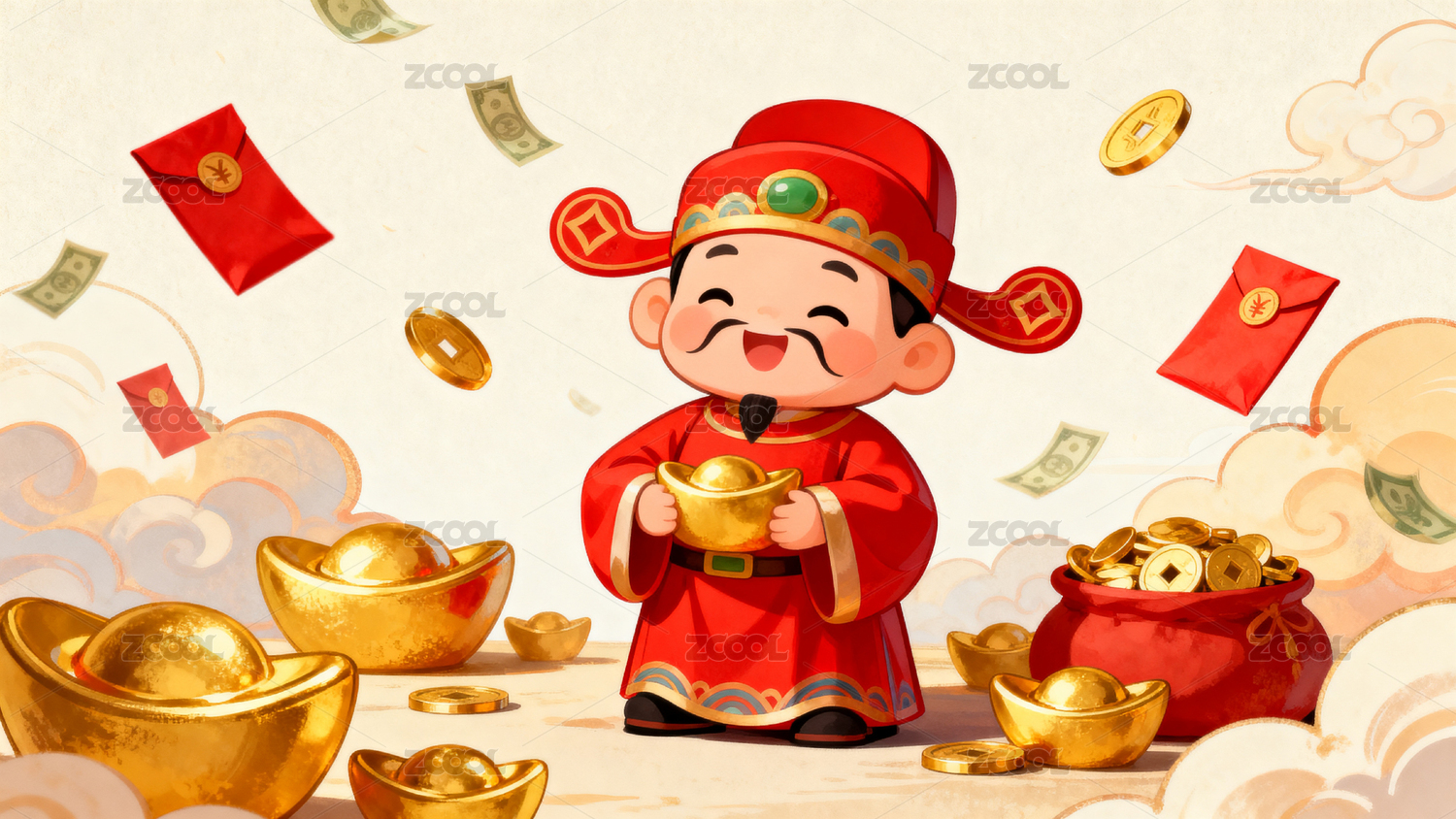 服饰,装饰,图案,传统,红色,节日,背景,财神,金元宝,云朵