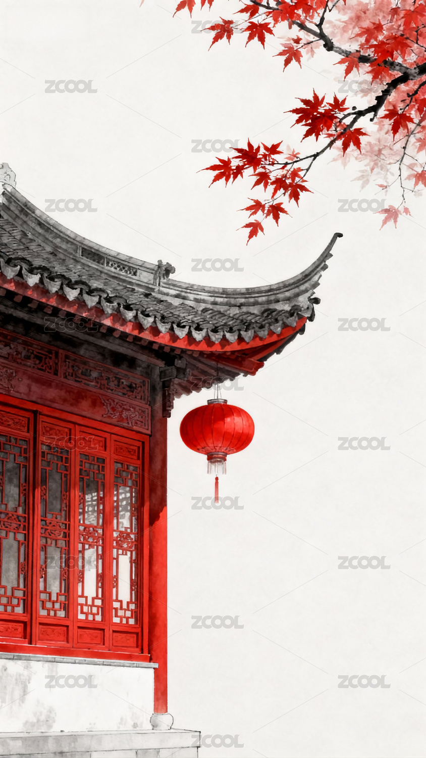 古风,中式,建筑,红亭,枫叶,红灯笼,中国风,水墨画,传统,秋季