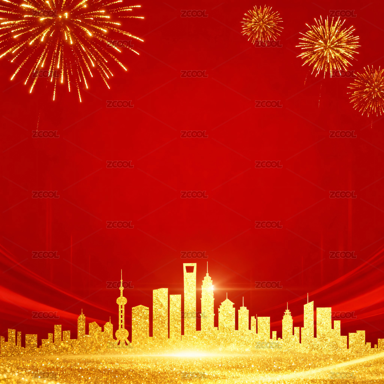 红色背景城市剪影与金色光效