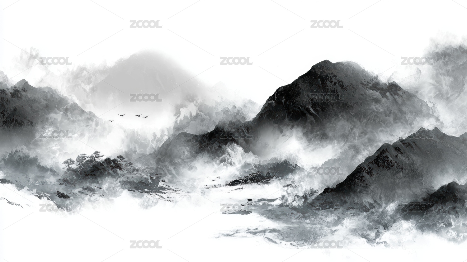 天空,树木,蓝色,白色,传统,艺术,山水,山峰,云雾,自然