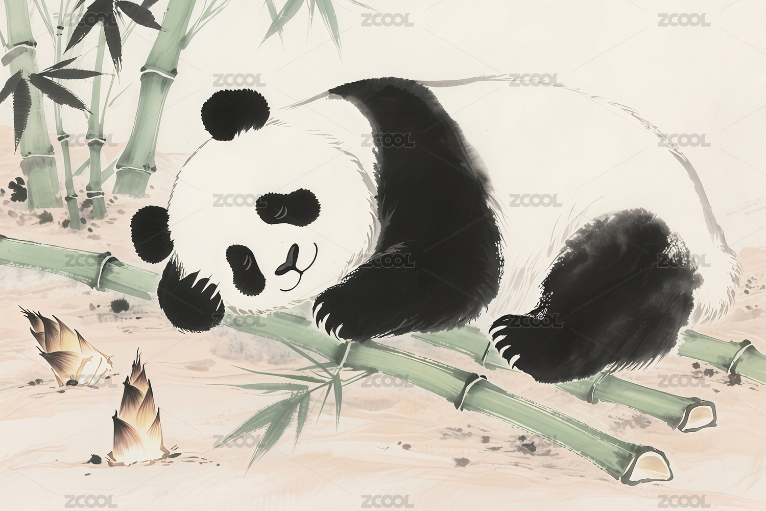 一只抱着竹子躺地上睡觉的可爱熊猫水墨插画