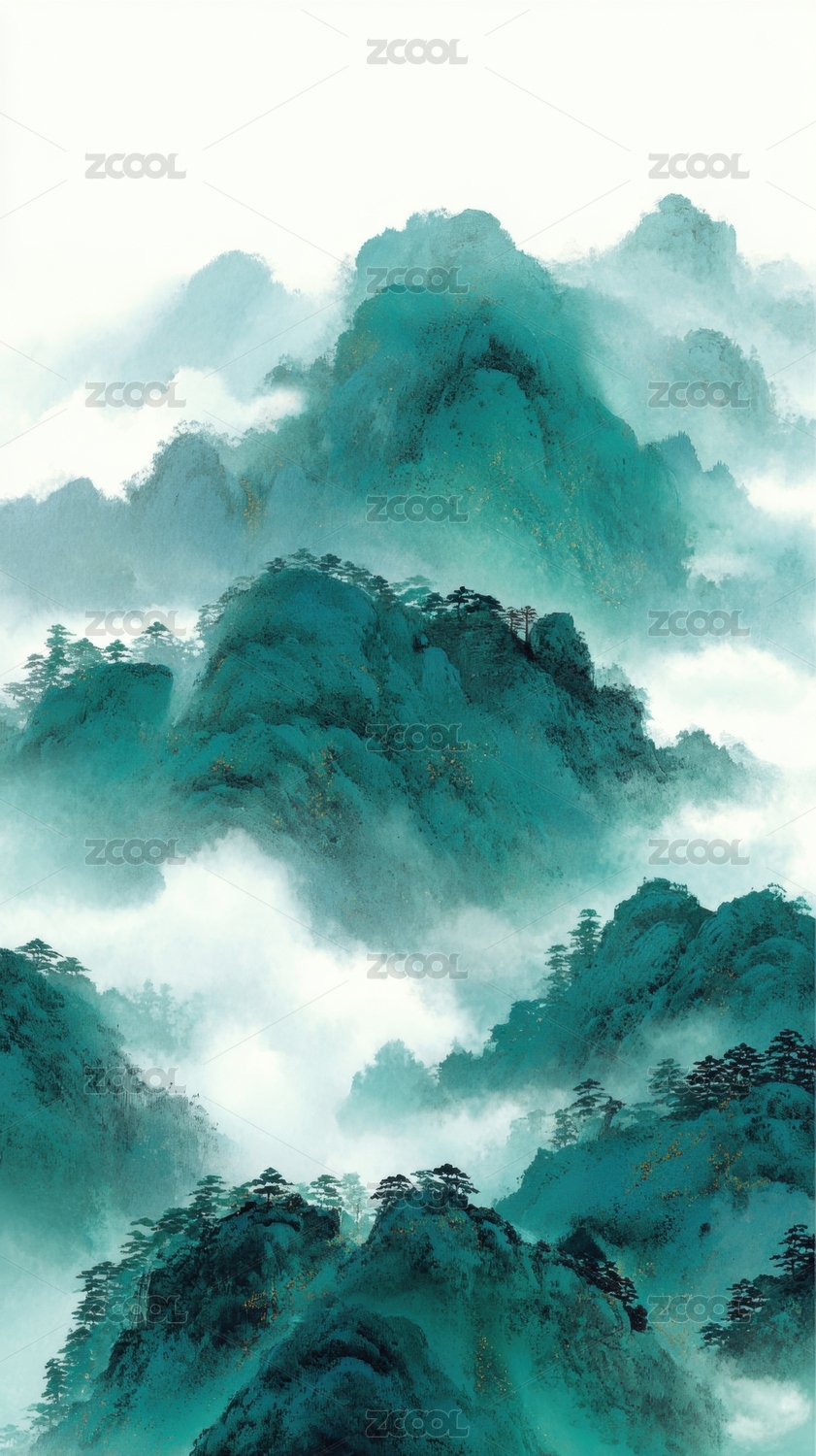 蓝色,白色,云雾,山峦,传统,艺术,山峰,水墨,树木,远山
